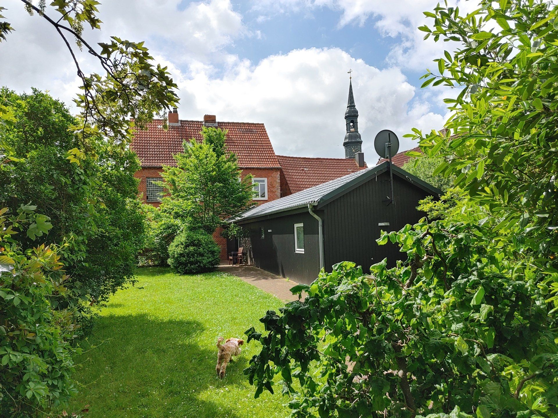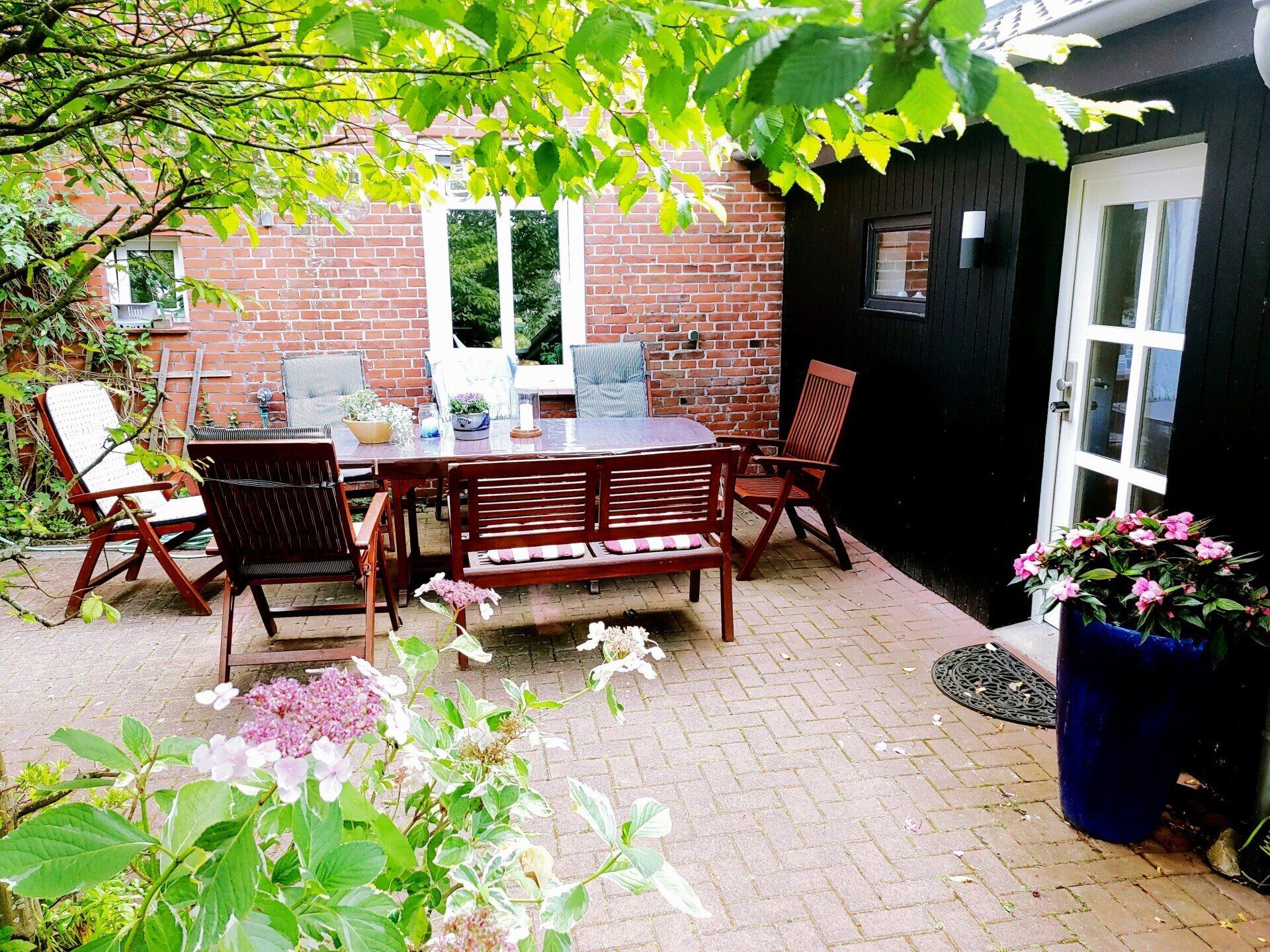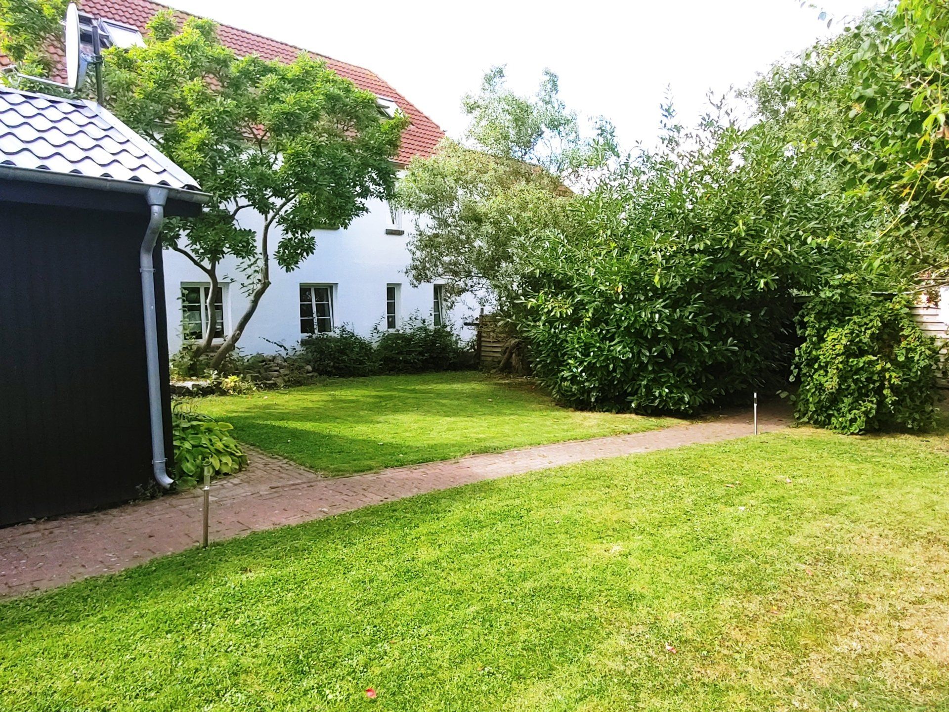 - großer sonniger Garten mit verschiedenen Sitzmöglichkeiten